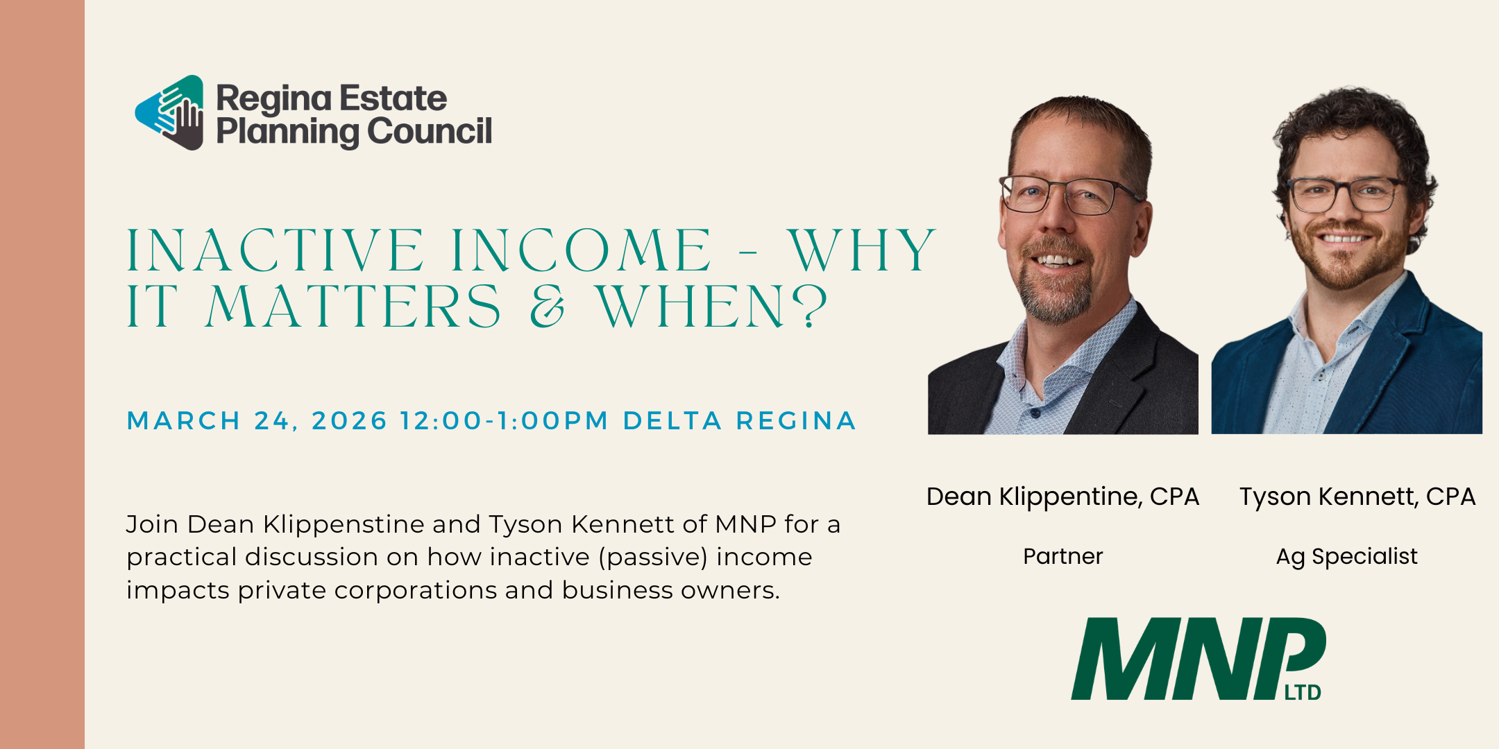 Join us for an insightful and practical discussion with Dean Klippenstine and Tyson Kennett of MNP as we explore the growing importance of inactive income in today’s tax and estate planning landscape.